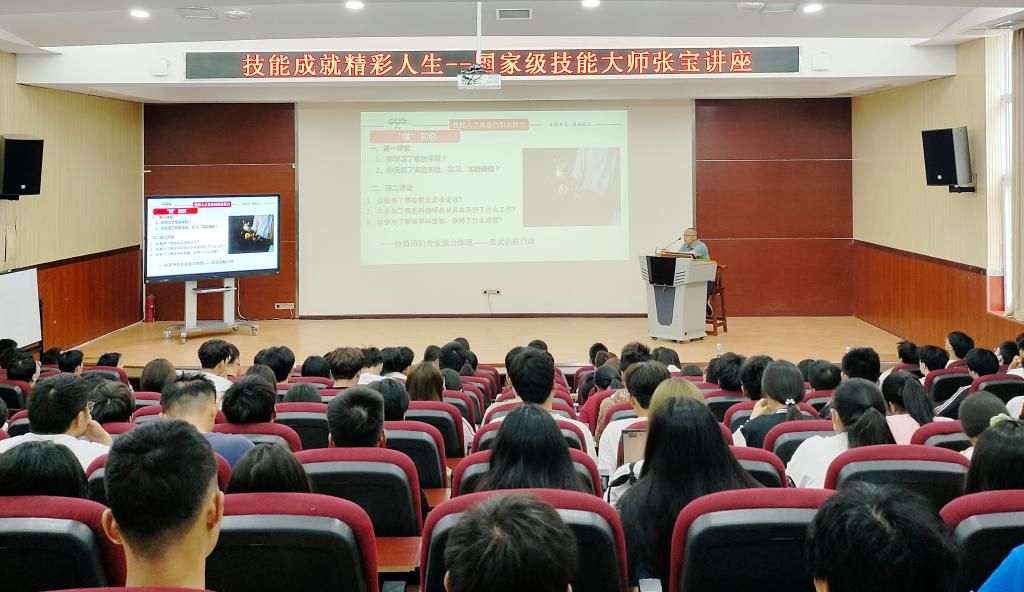 讲座中,张宝从新时代技能人才的机遇与发展、新时代技能人才的职业能力、新时代技能人才的职业精神、技能成就精彩人生——身边的优秀技能人才等四个方面重点讲解。他说,党的十八大以来,技能人才的政策环境持续得到改善,技能人才迎来了最好的时代。党的二十大报告将大国工匠、高技能人才同科学家和科技领军人才同时纳入到实施人才强国战略的重要位置,充分体现了党和国家对高技能人才的高度重视。职业教育前途广阔,技能人才大有可为。他鼓励同学们要把握机遇,坚定成才信心。张宝还结合自己几十年丰富的工作经验,给同学们讲解了什么是职业精神和工匠精神,并详细介绍了自己如何在生产一线刻苦努力钻研,进行技术改造和创新,一步一步成长为国家级技能大师的历程。