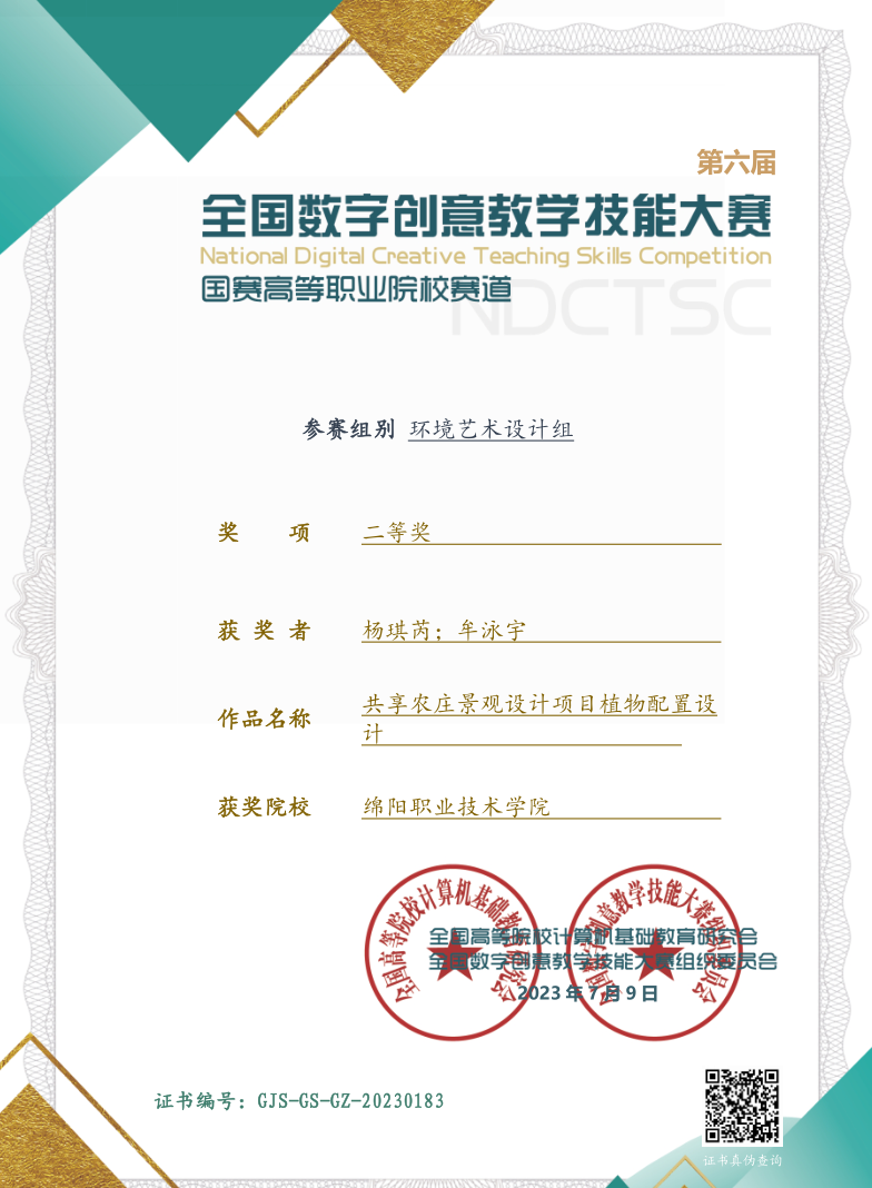 在第六届全国数字创意教学技能大赛高职学校赛道比赛中,米兰官网艺术设计学院牟泳宇、杨琪芮两位教师的参赛作品《共享农庄景观设计功能分区的表达方式》《共享农庄景观设计项目植物配置设计》分别斩获全国一、二等奖。