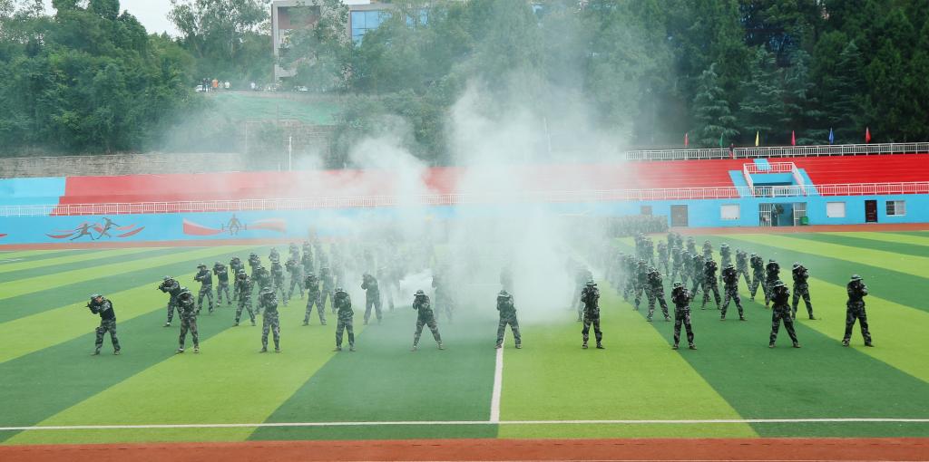 在军训成果汇报表演环节中,伴随着雄壮激昂的乐曲,一个个军训方队的同学,满怀青春的热情,踏着矫健的步伐,喊着嘹亮的口号,器宇轩昂地展示团队的风采,让在场领导和观众充分感受了新一代绵职人的青春活力。战术、拳术、匕首操、枪术、反恐演习等精彩纷呈的汇报表演,赢得了全场观众阵阵喝彩和掌声,也为本次军训交上了一份满意的答卷。(图/文 刘晨晨 杨智雯,杜健)