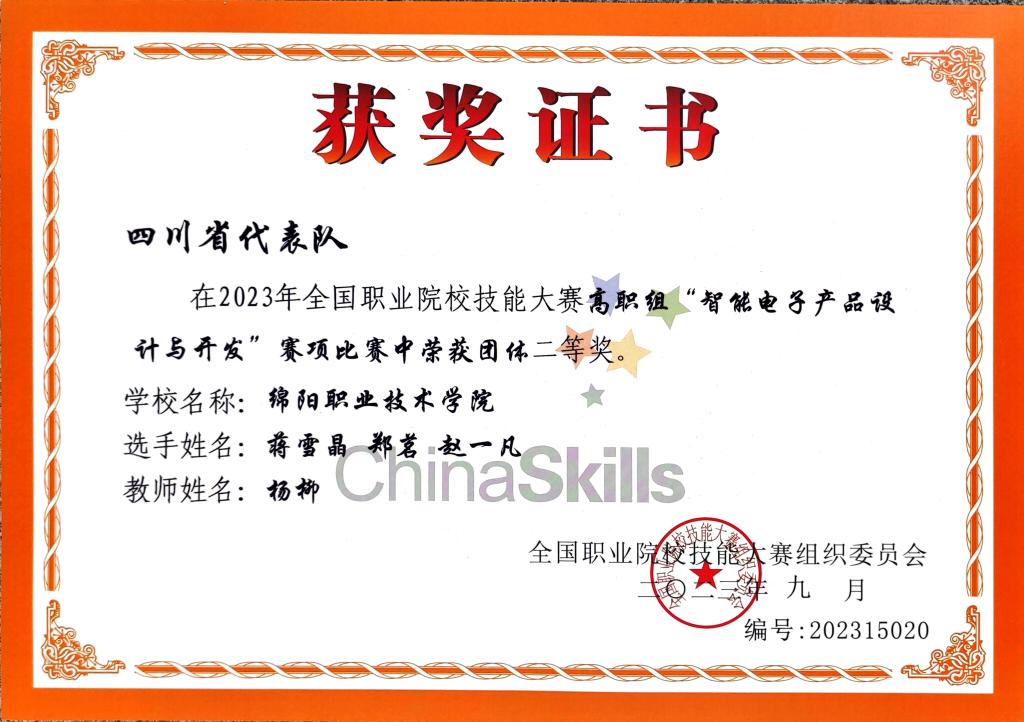 9月26日,2023年全国职业院校技能大赛高职组“智能电子产品设计与开发”赛项在烟台职业学院拉开帷幕,来自全国近60支队伍,300名选手在赛场上大显身手、比拼技能。由学校杨柳老师和蒋雪晶、郑茗、赵一凡组成的师生参赛团队代表四川省参加竞赛,经过激烈角逐,勇夺该赛项团体二等奖。
