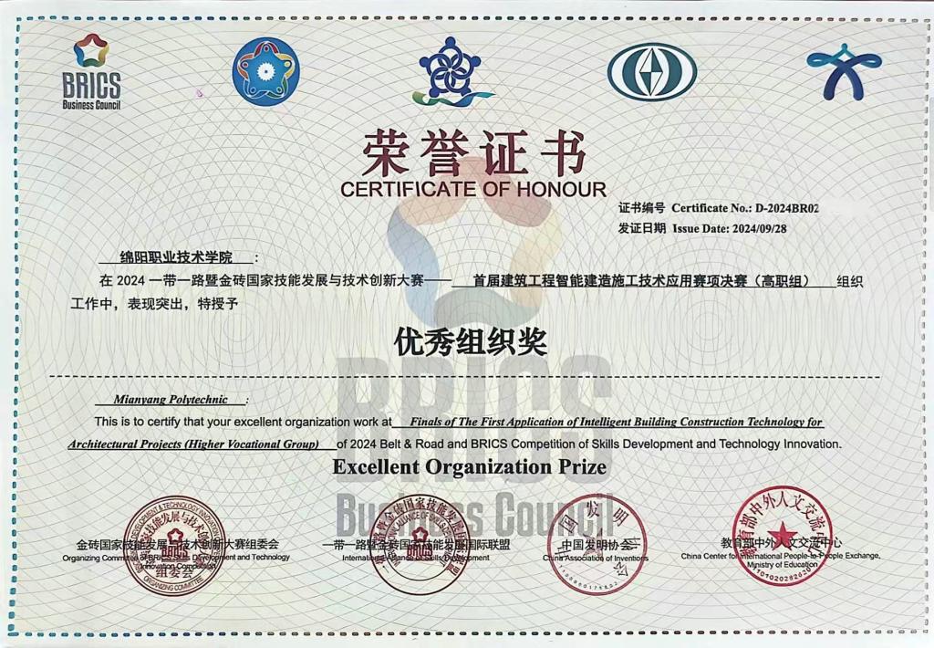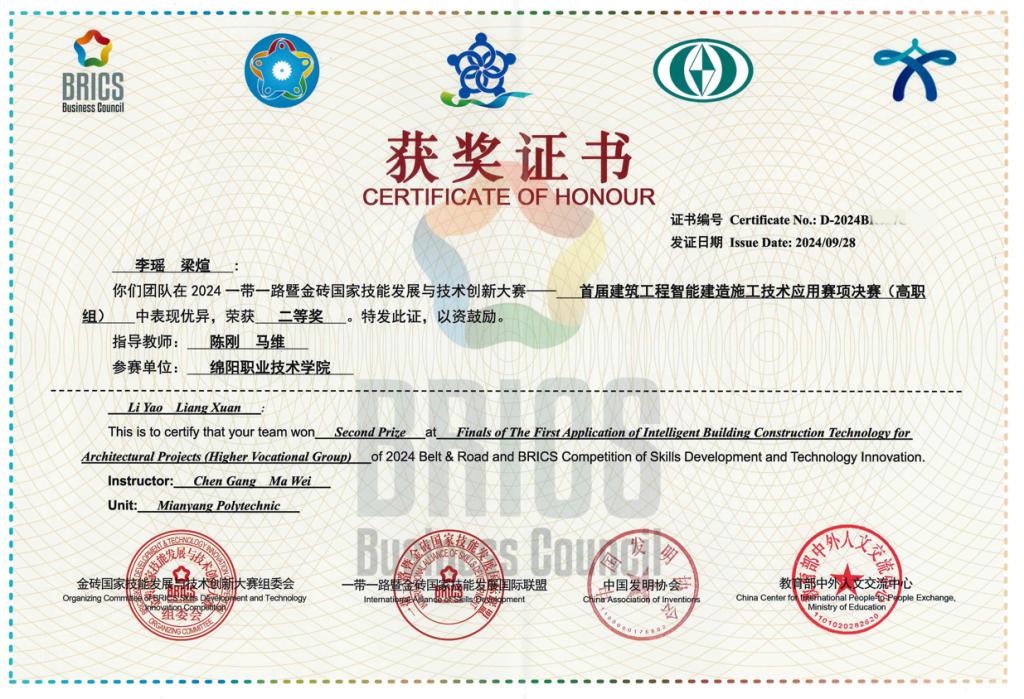 近日,由金砖国家工商理事会中方理事会、“一带一路”暨金砖国家技能发展国际联盟、教育部中外人文交流中心等联合主办的2024“一带一路”暨金砖国家技能发展与技术创新大赛首届建筑工程智能建造施工技术应用赛项在浙江建设职业技术学院举行。经过激烈角逐,米兰官网材料与建造学院学生李瑶、梁煊团队荣获大赛(高职组)二等奖;马维、陈刚荣获优秀指导教师奖。