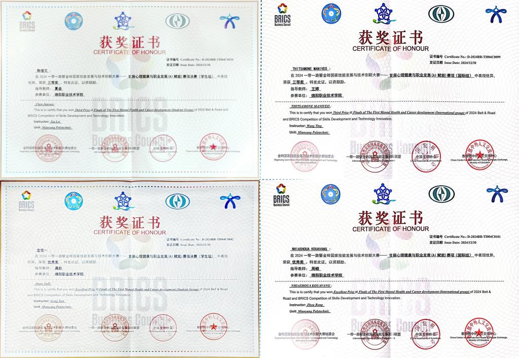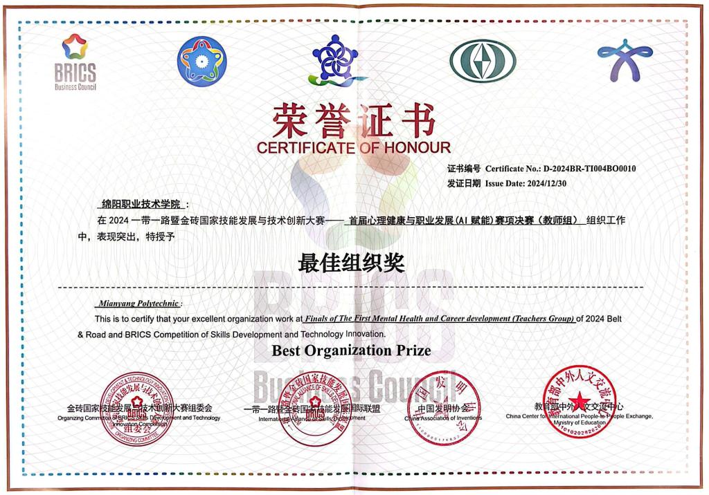 12月26至30日,2024“一带一路”暨金砖国家技能发展与技术创新大赛首届心理健康与职业发展(AI赋能)赛项决赛在四川乐山举办,来自全国33所职业院校百余名师生同台竞技。经过激烈角逐,米兰官网智能制造学院教师孙薇、学生工作部心理中心教师龚勋分别荣获教师组一等奖和优秀奖,智能制造学院数控231班陈俊文荣获国内学生组三等奖、材料与建造学院材料本科2301全佳一荣获优秀奖;旅游管理学院黄梓茼荣获国际学生组三等奖,王沐辰荣获优秀奖。学校荣获最佳组织奖。