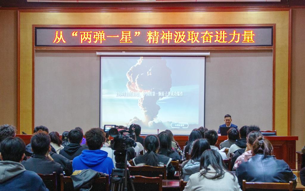 为深入开展学校理论宣讲工作,推进学校“大思政课”建设,弘扬“两弹一星”精神,11月14日,马克思主义学院、共青团ac米兰官网中文网站委员会联合举办了“从‘两弹一星’精神汲取奋进力量”专题宣讲,特邀团省委新时代文明实践青年宣讲分队成员、两弹城爱国主义教育基地文化宣讲主管范恒主讲。