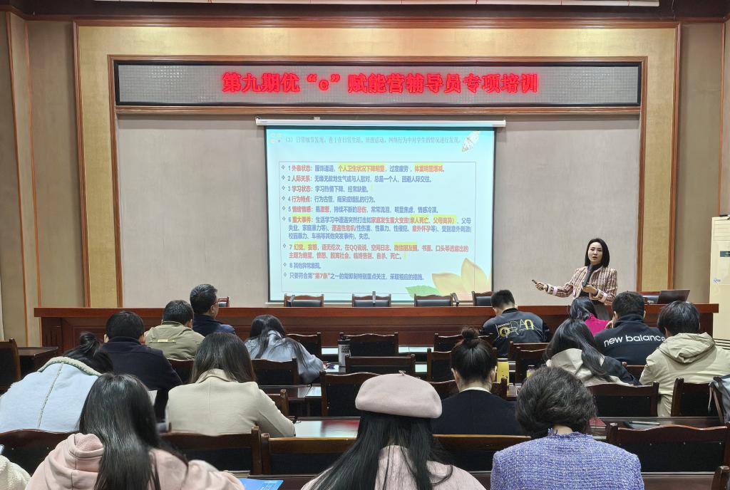 为加强辅导员对大学生心理危机早期表现的识别与应对能力,提高学校心理危机预防与干预工作实效,11月22日上午,心理健康教育与咨询中心在行政楼一楼会议室开展第9期优“e”赋能营辅导员专项培训。培训由学工部副部长、心理健康教育与咨询中心主任佘洋燕主讲,全体辅导员及心理干事参培。