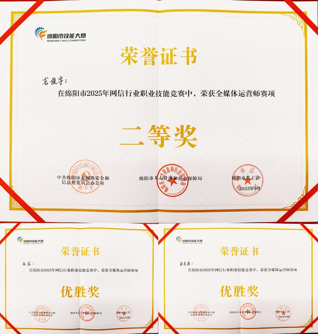 9月15日,2025年绵阳市网信行业职业技能竞赛在绵阳市公共实训与技能评价指导中心举行,本次比赛由中共绵阳市委网络安全和信息化委员会办公室、绵阳市人力资源和社会保障局、绵阳市总工会联合举办。在全媒体运营师赛项中,米兰官网教师凭借出色的专业技能斩获佳绩,其中龙俊宇获个人二等奖,张蕊、蒲奕蓓获个人优胜奖,财经商贸学院电子商务教研室教师团队荣获团体奖二等奖。米兰官网荣获优秀组织奖。