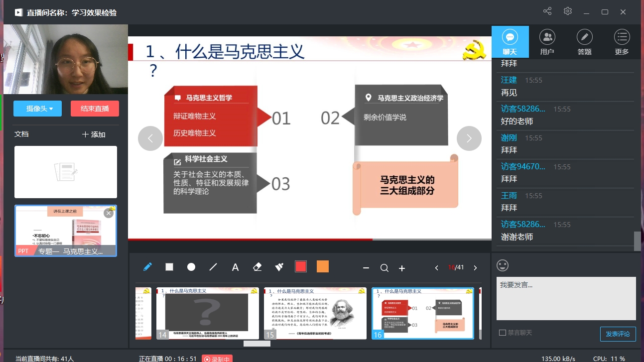 来自有机材料教研室的王燕老师第一时间分享了她的首次线上上课的感受,她讲到,课前,已将课程内容及要求、PPT等发布到教学班级的学习通平台上,课件文字清晰可见,声音清晰。课中,老师时不时发起讨论和抢答,让学生都参与进来,带动学生学习的积极性,课后在线发布作业,整个过程进行顺利。