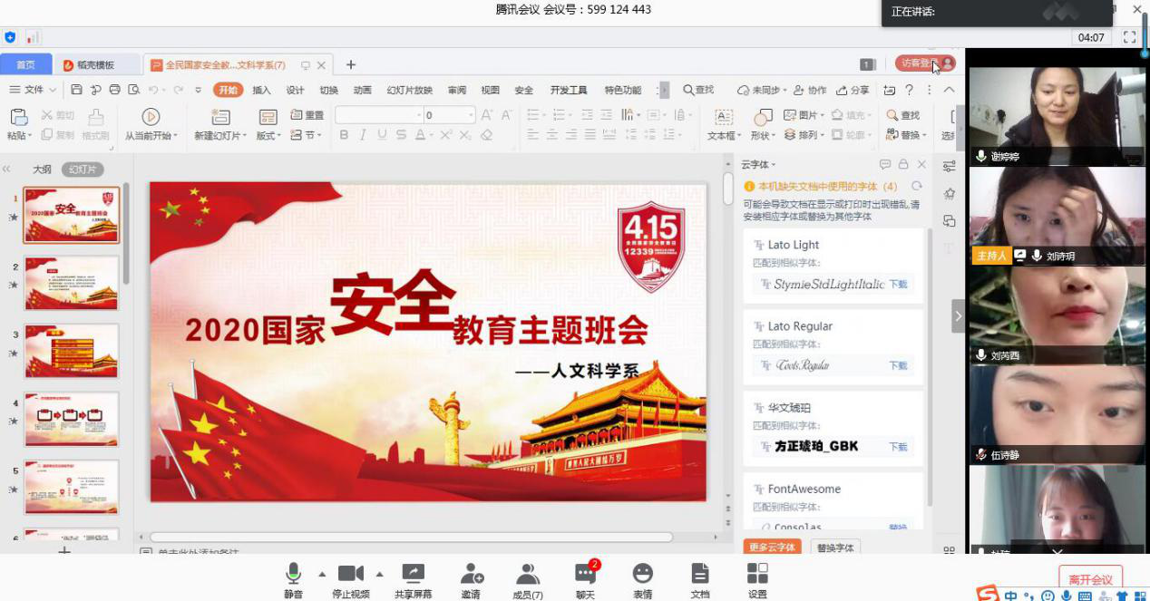 各院(系)充分结合疫情防控、开学复课以及在线学习等实际情况,通过在线阅读、学习强国APP、微信APP等形式,组织师生认真学习了《中华人民共和国国家安全法》、《总体国家安全观》等相关内容;还组织全体学生通过互联网参与了“千万学生同上一堂国家安全教育课”的学习,认真观看了清华大学公共安全研究院范维澄、陈建国所讲的“总体国家安全观视角下的疫情防控”网络公共安全课。