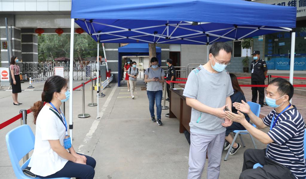 上午9时,各项演练有序推进。在学生返校演练场景中,学生出示健康码入校,有序排队,按规定保持间隔距离。疫情检测组工作人员逐一检测学生体温,发现有学生体温异常时,工作人员立即引导其前往临时留观点等候,确认体温异常时,启动应急处置。
