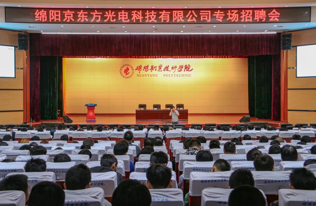 汪壮和毕业生代表发言后,学院2021届毕业生就业工作正式启动,举行了绵阳京东方光电科技有限公司专场宣讲招聘会。