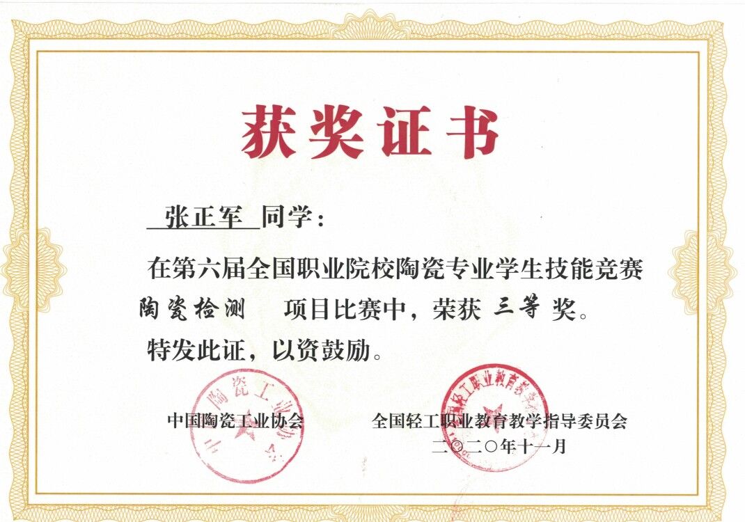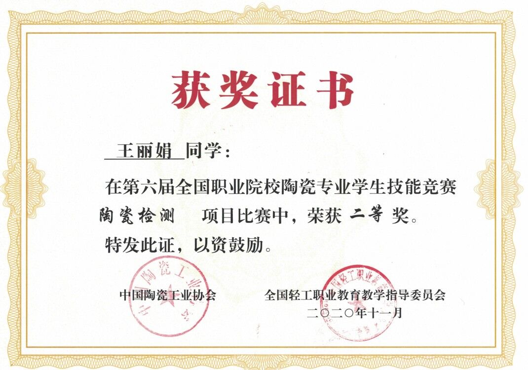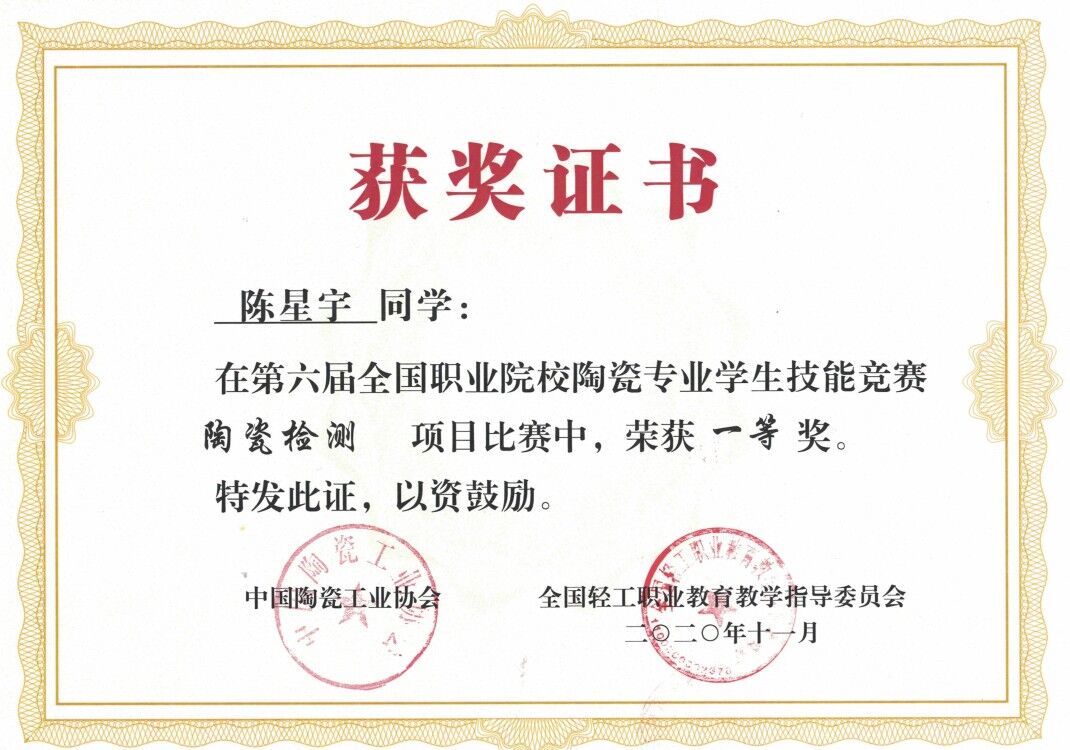 11月21日-11月22日,2020年第六届全国职业院校陶瓷专业技能大赛成绩公布,材料工程系建材184班陈星宇同学荣获“陶瓷检测”项目比赛一等奖,建材184班王丽娟同学荣获“陶瓷检测”比赛二等奖,建材184班的张正军和刘红交同学荣获“陶瓷检测”比赛三等奖,梅朝鲜老师荣获优秀指导教师奖。