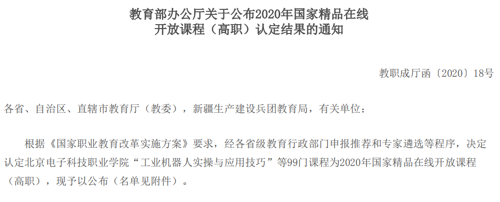 近日,教育部办公厅发布了《关于公布2020年国家精品在线开放课程(高职)认定结果的通知》,认定99门课程为2020年国家精品在线开放课程(高职)。