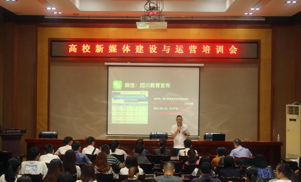 为全面加强党的建设,推进意识形态工作责任制落实落细,繁荣学校网络文化,持续加强和完善新媒体矩阵建设,同时作为党史学习教育“我为群众办实事”的具体举措——切实提高各单位(部门)利用新媒体的能力和水平,6月9日,学校举办“高校新媒体建设与运营”专题培训会。会议特邀四川省教育厅新媒体主编、教育部“星火计划”联盟单位骨干成员黄国兵主讲,全校各单位(部门)宣传委员、新媒体运营人员、网站管理员、各系学生党支部书记和团总支书记参加培训。