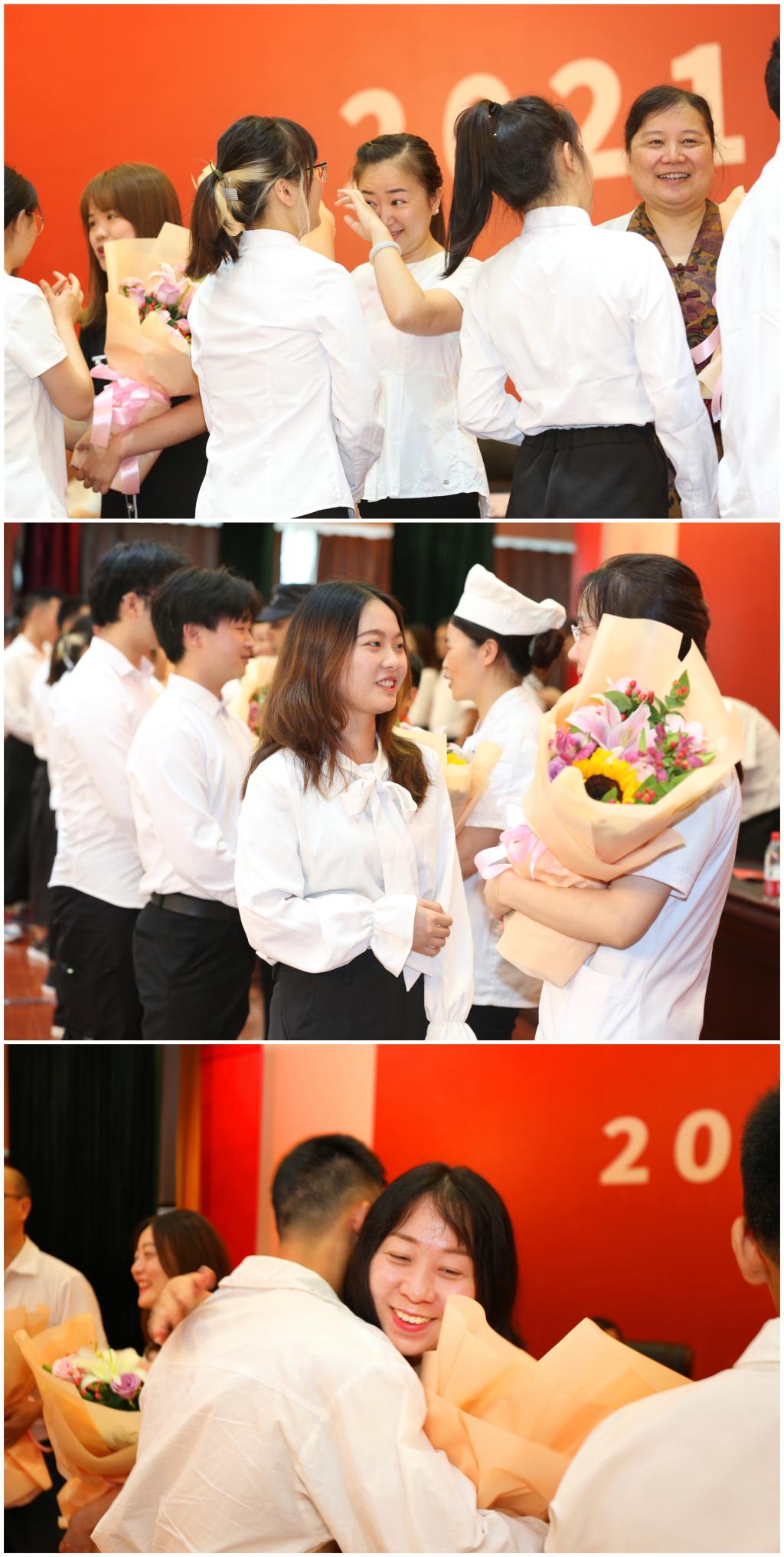 随后,毕业生代表上台向教师及辅导员代表献花,表达对老师们的深深谢意和美好祝愿。师生们依依惜别,深情拥抱,互道祝福,依依不舍的气氛弥漫全场,台下观众纷纷报以热烈掌声。典礼在全体师生合唱校歌《花之愿》的歌声中缓缓落幕。(文/图 刘晨晨;刘晨晨、张文玺)