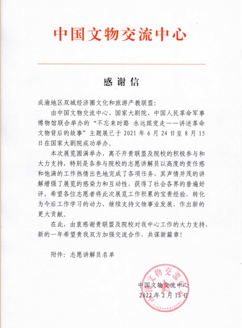 由中国文物交流中心、国家大剧院、中国人民革命军事博物馆联合举办的“不忘来时路 永远跟党走——讲述革命文物背后的故事”主题展已于2021年6月24日至8月15日在国家大剧院成功举办。米兰官网旅游与管理学院学生林雪莹和乔英以志愿讲解员的身份参加了该主题展的讲解活动,并获通报感谢。