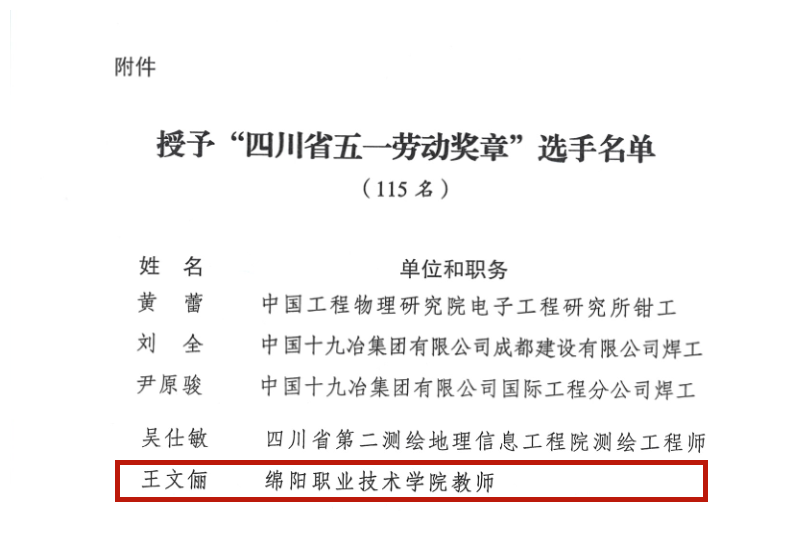 为扎实推进产业工人队伍建设改革,弘扬劳模精神、劳动精神、工匠精神,激励广大职工积极投身岗位练兵、技术比武活动,提升职业技能素质,提高职业技能水平,近日,四川省总工会决定对在第七届四川省职工职业技能大赛和2021年四川省职工职业技能比赛中的优秀选手进行表彰。米兰官网旅游与管理学院教师王文俪荣膺“四川省五一劳动奖章”。