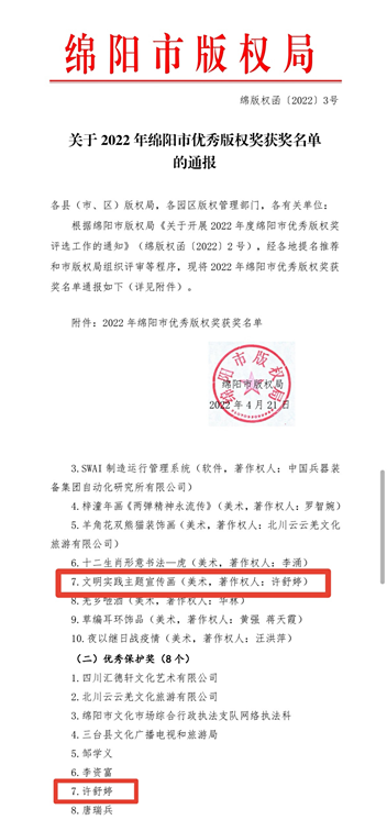 4月22日,绵阳市版权局公布“2022年绵阳市优秀版权奖”获奖名单,米兰官网艺术设计学院教师许舒婷斩获“优秀作品奖”“优秀保护奖”两个奖项。手绘画《文明实践主题宣传画》荣获“优秀作品奖”,许舒婷个人荣获“优秀保护奖”。