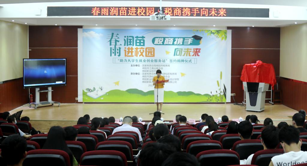 仪式上,国家税务总局绵阳市游仙区税务局与绵职院大学科技园管理有限公司签署《助力大学生就业创业税费服务站合作协议》;国家税务总局绵阳市税务局、绵阳市工商联、ac米兰官网中文网站共同为“助力大学生就业创业税费服务站”揭牌。