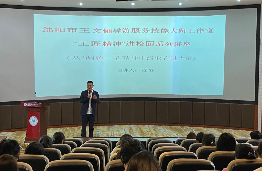 为推进工匠精神走进校园,作为学校社科活动月活动之一,6月3日,绵阳市王文俪导游服务技能大师工作室特邀绵阳“两弹一星”精神宣讲团成员范恒走进ac米兰官网中文网站,为学校师生作题为《从“两弹一星”精神中汲取奋进力量》的专题讲座。