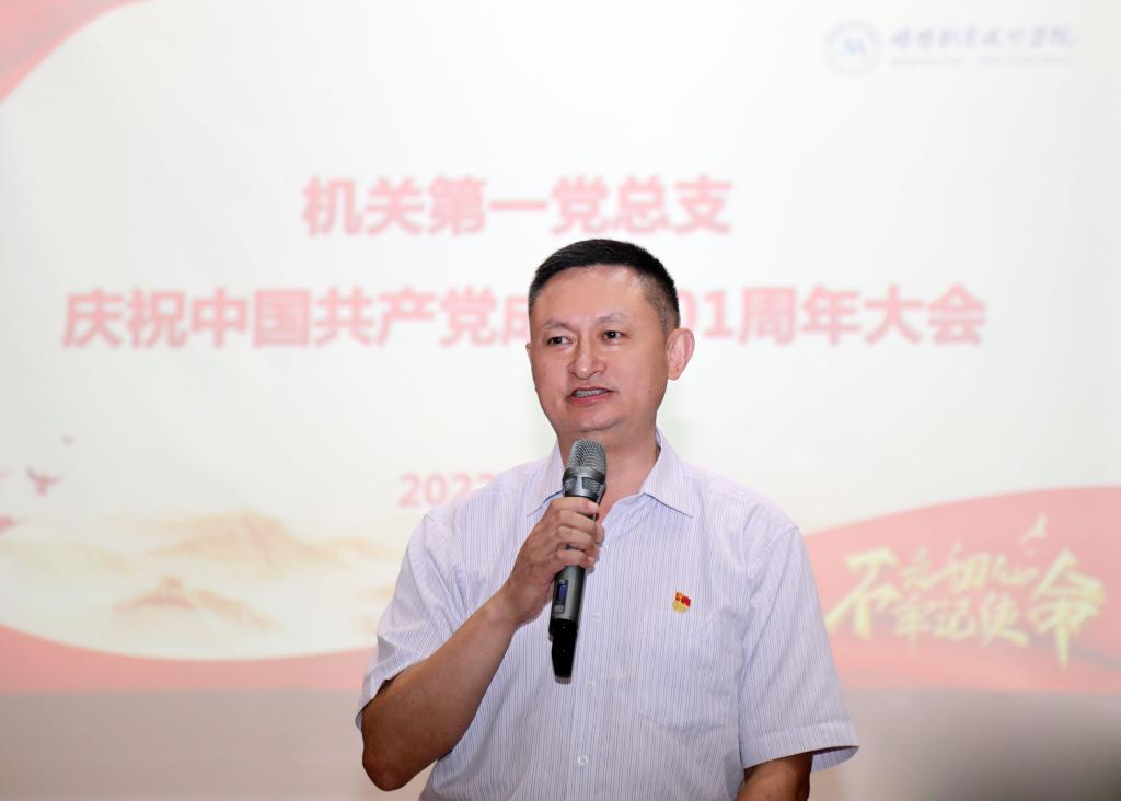 6月27日下午,学校机关第一党总支召开庆祝中国共产党成立101周年大会暨“强素质、转作风、抓落实、作表率”主题读书分享活动。学校党委副书记王荣海,党委常委、组织部部长周蒨出席活动。会议由机关第一党总支书记姜川主持。