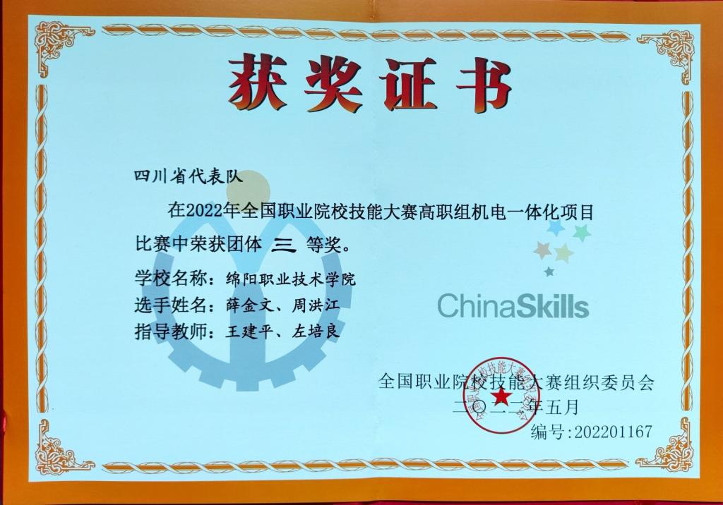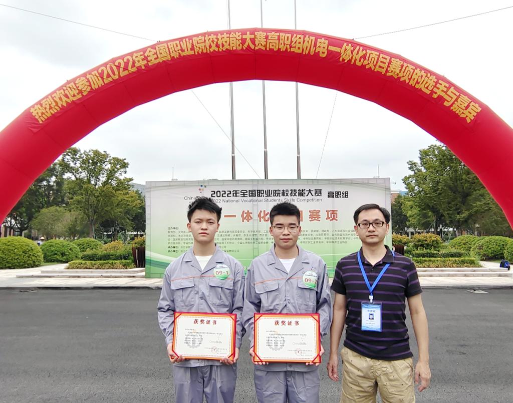 8月25-28日,全国职业院校技能大赛(高职组)“机电一体化项目”赛项在浙江机电职业技术学院举行。由米兰官网智能制造学院王建平、左培良两位老师指导,工业机器人技术专业薛金文、周洪江两位同学组成的参赛团队代表四川省参加竞赛,与全国55所高水平的顶尖院校选手同台竞技,经过激烈角逐,荣获该赛项三等奖。