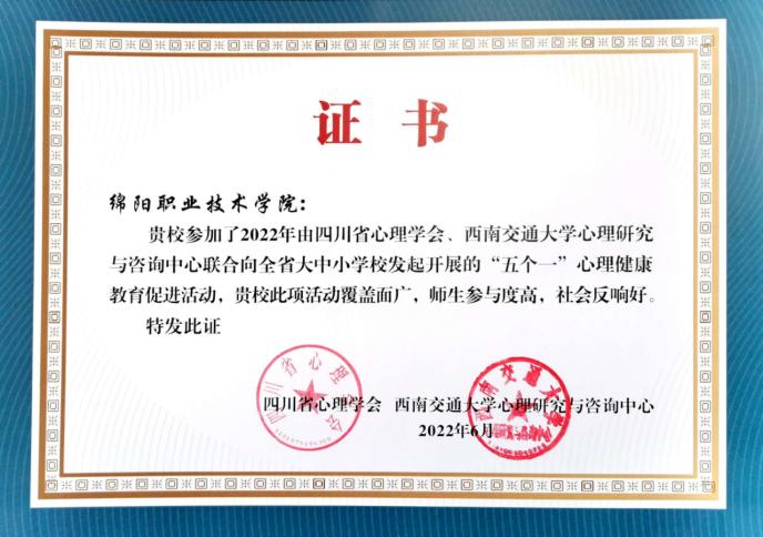 为贯彻落实《关于加强学生心理健康管理工作的通知》(教思政厅函〔2021〕10号)《四川省教育厅关于进一步加强高校心理健康教育工作的通知》(川教函〔2022〕214号)精神,牢固树立健康第一的教育理念,提升学生心理健康素养,四川省心理学会和西南交通大学向全省大中小学发起开展“五个一”心理健康促进行动倡议。米兰官网积极响应,同省内各院校共同携手构建全省学校心理健康保障体系,助力学生的健康成长,活动成果突出,获得省级表彰。