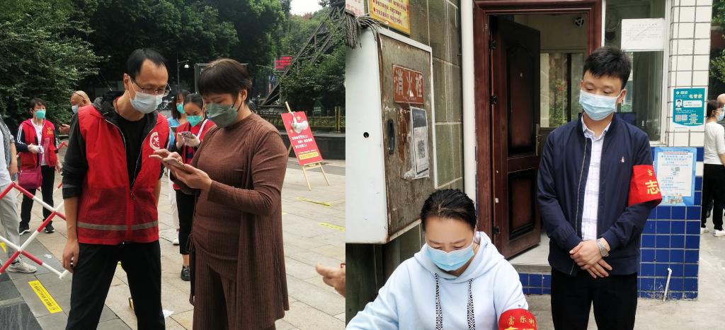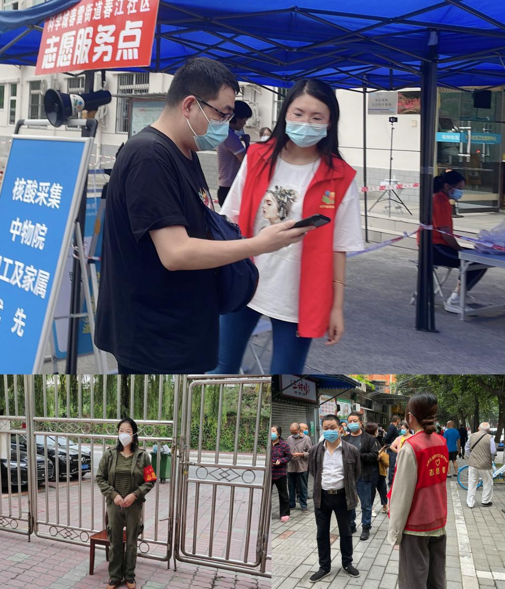 机关二党总支贾国均、彭文、刘浏、周永斌等在沈家坝等社区协助工作人员进行核酸检测信息登记和秩序维护等工作。“抗疫有我,风雨共担,凝心聚力,共克时艰,为疫情防控贡献自己的一份力量!”