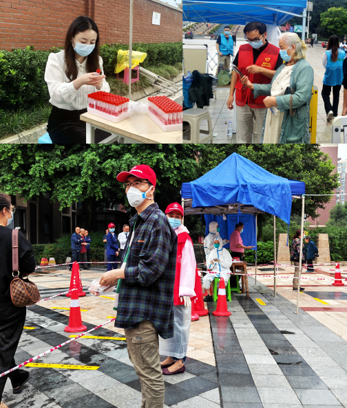后勤党总支张靖楠、郑知知等教师在所属社区核酸采集点维持秩序。“疫情无情人有情!哪里有疫情,哪里就是我们党员用责任和担当点燃工作热情的战场。服务社会,温暖他人,奉献自己,一路芬芳。”