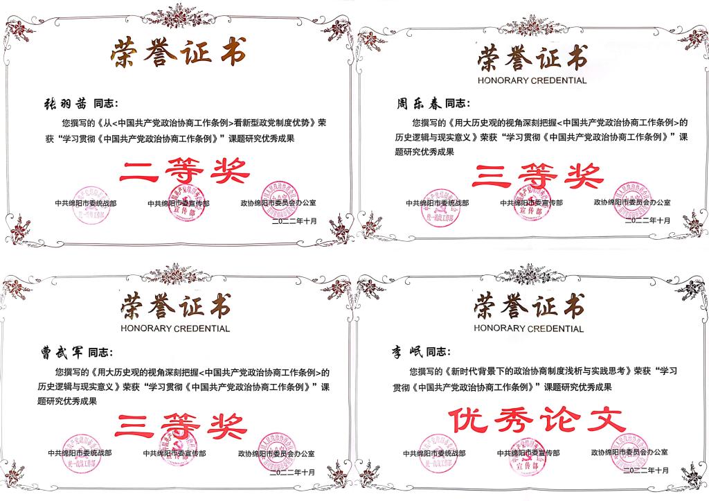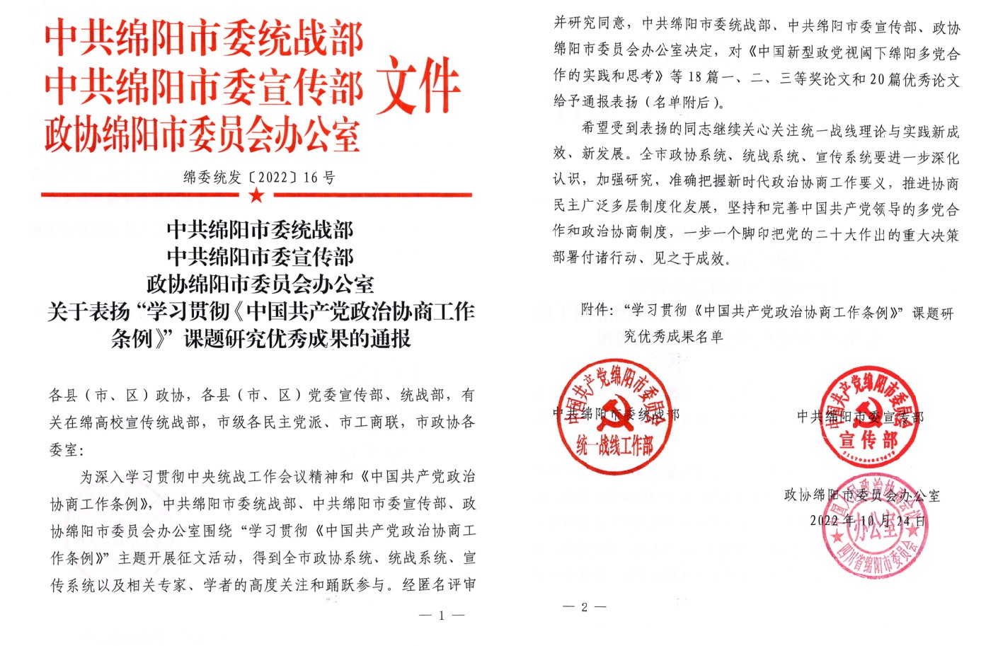 为深入学习贯彻中央统战工作会议精神和《中国共产党政治协商工作条例》,近日,中共绵阳市委统战部、中共绵阳市委宣传部、政协绵阳市委员会办公室围绕“学习贯彻《中国共产党政治协商工作条例》”主题开展征文活动。米兰官网教师踊跃参加。米兰官网教师张羽茜的《从<中国共产党政治协商工作条例>看新型政党制度优势》获二等奖,周乐春、曹武军的《用大历史观的视角深刻把握<中国共产党政治协商工作条例>的历史逻辑和现实意义》获三等奖,李岷的《新时代背景下的政治协商制度浅析与实践思考》获优秀论文奖。