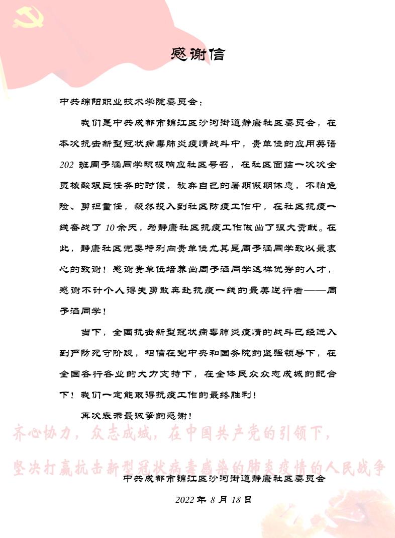 近日,成都市沙河街道静康社区党委向学校寄来感谢信,信中赞扬旅游与管理学院应用英语202班学生周予涵,在四川成都“7.20”和“8.25”两场疫情防控阻击战中,积极投身志愿服务工作,彰显了新时代大学生的责任与担当,对米兰官网人才培养和思政教育工作的成效表示肯定。