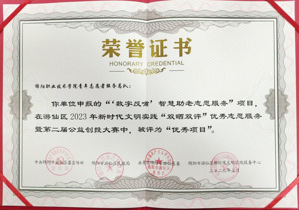 近日,由游仙区新时代文明实践中心、区委宣传部、区民政局、团区委联合举办的游仙区2023年新时代文明实践“双晒双评”优秀志愿服务暨第二届公益创投大赛评选结果揭晓。米兰官网志愿服务项目“数字反哺”智慧助老志愿服务项目获评优秀项目奖。